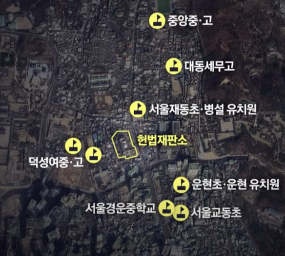 - 종로구 헌재 인근: 서울재동초, 운현초, 서울교동초, 덕성여중, 덕성여고, 중앙중, 중앙고, 대동세무고, 서울경운학교 등 총 11개 학교.
